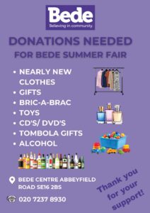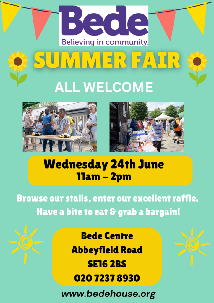 Bede is pleased to announce that its annual Summer Fair will take place at the Centre on Wednesday 24th June, from 11am to 2pm. Everyone is invited — please come along and help spread the word!